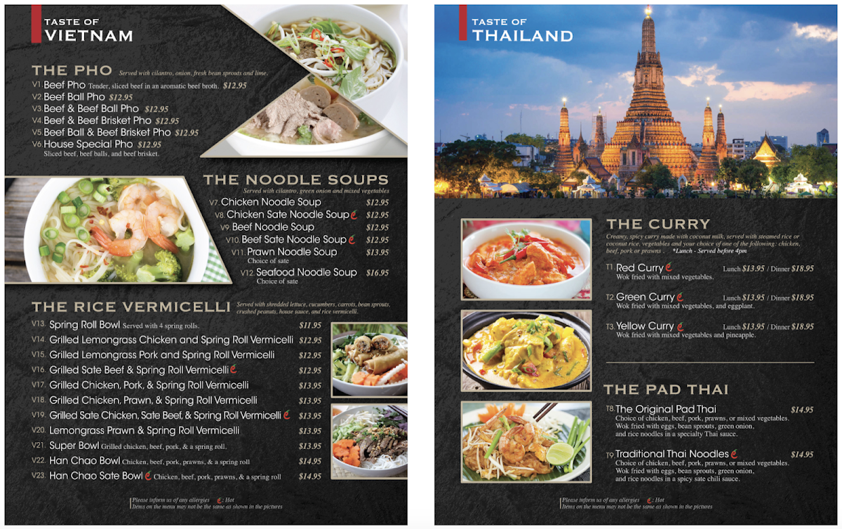 For a refreshing and flavorful choice, the Rice Vermicelli dishes are highly recommended, such as the Grilled Sate Beef & Spring Roll Vermicelli (V16) or the Han Chao Bowl (V22), both of which combine grilled meats, fresh herbs, and crispy spring rolls.