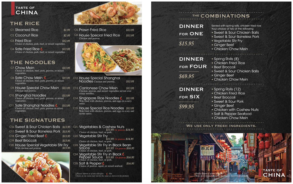 Including 2 spring rolls, chicken fried rice and your choice of two of the following: Sweet and sour chicken balls, swee and sour boneless pork, vegetable stir fry, ginger beef and chicken chow mein.