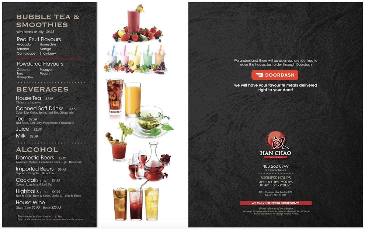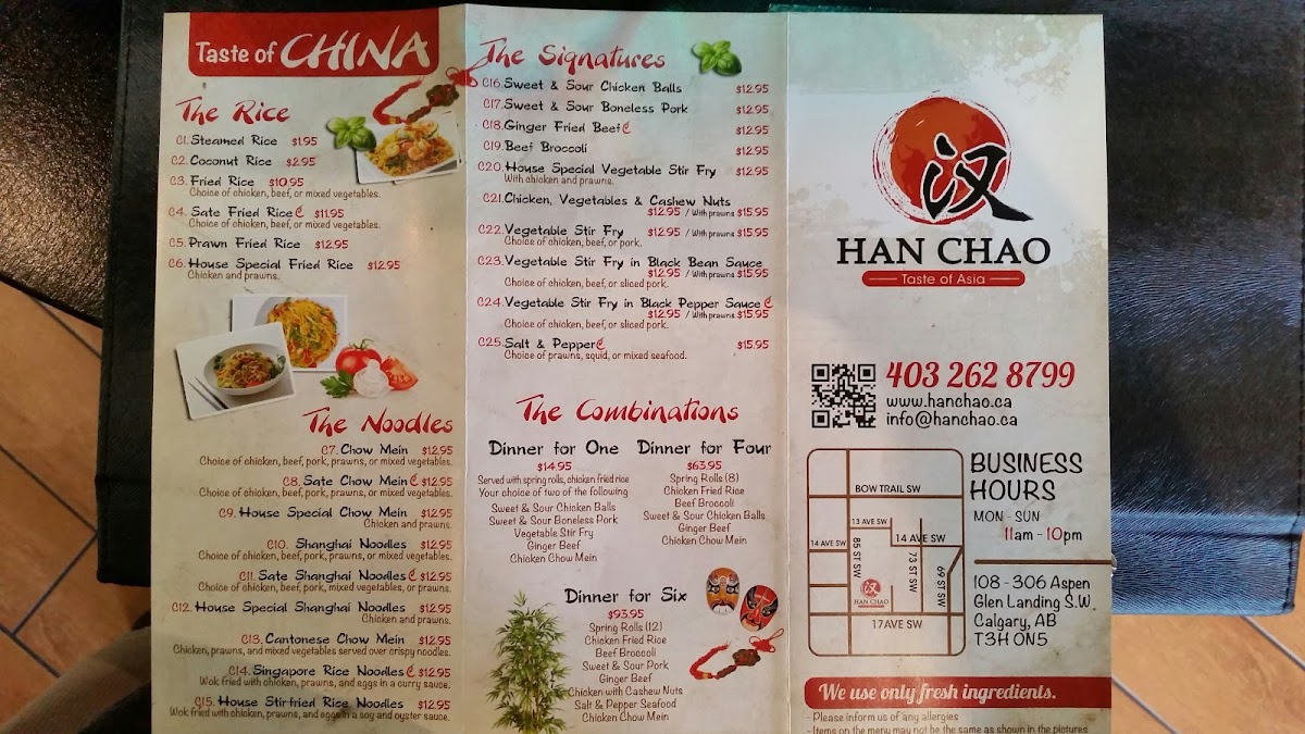 The menu at Han Chao, Taste Of Asia, offers a delightful variety of dishes inspired by the diverse flavors of Asia, all served in a welcoming and vibrant atmosphere. For those looking to enjoy a hearty meal with friends or family, the "Combinations" section is perfect, with options like Dinner For Six, Dinner For Four, and Dinner For One, all offering well-balanced selections (prices for these sets are available upon request).